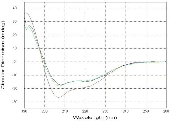 The figure shows the CD spectra of the PSTD in the absence (red) and presence of the mixture of CMP-Sia and polySia (green) and the mixture of CMP-Sia, polySia, and LFcinB11 (blue). The helical contents of these three CD spectra of the PSTD are 23%, 16.4%, and 14.8%, respectively.