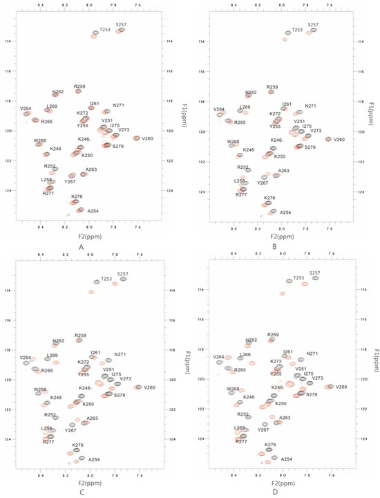 The figure shows the overlaid 1H-15N HSQC spectra of the 2 mM PSTD in the absence and presence of 20 μM LFcinB11 (A), 40 μM LFcinB11 (B), 60 μM LFcinB11 (C) and 80 μM LFcinB11 (D), respectively.