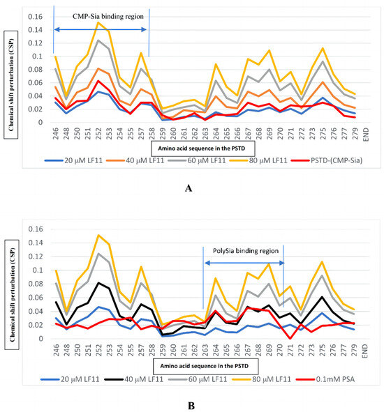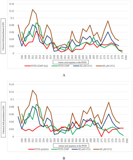 The figure shows the chemical shift perturbations (CSPs) of the PSTD when the PSTD interacted with 20 μM LFcinB11 (blue), 40 μM LFcinB11 (orange), 60 μM LFcinB11 (gray), and 1 mM CMP--Sia (red), respectively (A); chemical shift perturbations (CSPs) of the PSTD when the PSTD interacted with 20 μM LFcinB11(blue), 40 μM LFcinB11 (black), 60 μM LFcinB11 (gray), 80 μM LFcinB11 (orange), and 0.1 mM polySia (red), respectively (B).