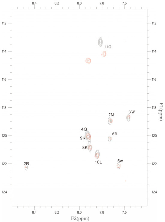 The figure shows the overlaid 1H-15N HSQC spectra of 50 μM LFcin11 in the absence (black) and presence of 50 μM polySia (red), respectively.