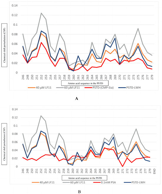 The figure shows the chemical shift perturbations (CSPs) of the PSTD when interacting with 1 mM CMP-Sia, 80 μM CMP, 40 μM, and 60 μM LFcinB11, respectively (A), and the CSPs of the PSTD when interacting with 0.1 mM PSA, 1 mM CMP, 40 μM, and 60 μM LFcinB11, respectively (B).