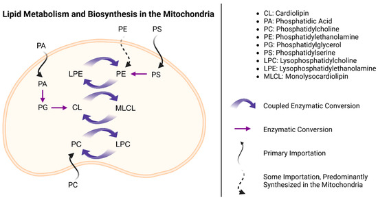 Phospholipid synthesis in mitochondria generally follows one of two possible pathways. Phospholipid species such as PE and PG can be imported or synthesized directly within the mitochondria, whereas PC and PS must first be synthesized in the endoplasmic reticulum before transportation into the mitochondria [52]. CL is also synthesized directly in mitochondria, like PE and PG, but it undergoes a unique remodeling step that can differ slightly depending on the tissue in which it is made (Figure 2).