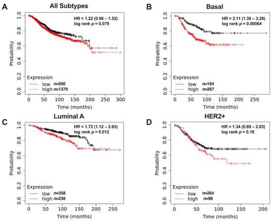 IL13RA1 expression and overall survival from KM plotter (www.kmplot.com, accessed on 16 April 2024) using publicly available data, as described []. (A) In patients with all subtypes (n = 1879), overall survival is not statistically different between patients whose tumors have high versus low IL13RA1 expression. (B) High IL13RA1 expression in tumors from patients with the basal subtype of breast cancer (n = 431) have significantly reduced survival. (C) IL13RA1 expression in tumors from patients with the Luminal A subtype (n = 596) moderately impacts survival. (D) In HER2+ patients (n = 362), IL13RA1 expression does not correlate with survival.