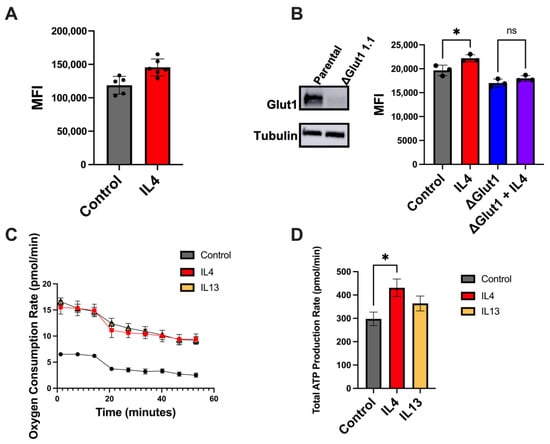 IL4 increases glucose uptake and metabolism in TNBC cell lines. (A) Treatment with 10 ng of IL4 increases glucose uptake in 4T1 murine mammary cancer cells, as assessed by the NBDG assay. (B) The Glut1 protein is undetectable in ΔGlut1 MDA-MB-231 cells generated using CRISPR/Cas9, and treatment with 20 ng of IL4 shows that an IL4-induced increase in glucose uptake is dependent on GLUT1 expression. (C) Pre-treatment (24 h) with 20 ng of IL4 or IL13 results in increased oxygen consumption rates in MDA-MB-231 cells, as measured by the Seahorse ATP rate assay. (D) Pre-treatment (24 h) with 20 ng of IL4 or IL13 results in increased total ATP production in MDA-MB-231 cells, as measured by the Seahorse ATP rate assay. Seahorse readings were normalized to the cell number. Representative images from experiments that were repeated at least 3 times are shown. * p < 0.05, ns = non-significant.