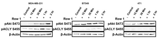 IL4 treatment induces the phosphorylation of Akt and ATP citrate lyase (ACLY). Treatment with 20 ng of species-specific IL4 results in increased phosphorylation of AKT at serine 473 and ACLY at serine 455 over time in human MDA-MB-231, human BT549, and murine 4T1 cells. Representative images from at least 2 repeats per cell line are shown.