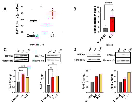 HAT activity assay: MDA-MB-231 cell lines were treated with 10 ng of recombinant human IL4 (BD Biosciences) for 24 h. After treatment, nuclear extracts were collected using NE-PER Nuclear and Cytoplasmic Extraction Reagents (Thermo Scientific). HAT activity was measured using the Histone Acetyltransferase Activity Assay Kit (Abcam, Cambridge, MA, USA) following the manufacturer’s protocol. The protein concentration of nuclear extracts was measured using the BCA assay. HAT activity was normalized to the protein concentration of each sample.