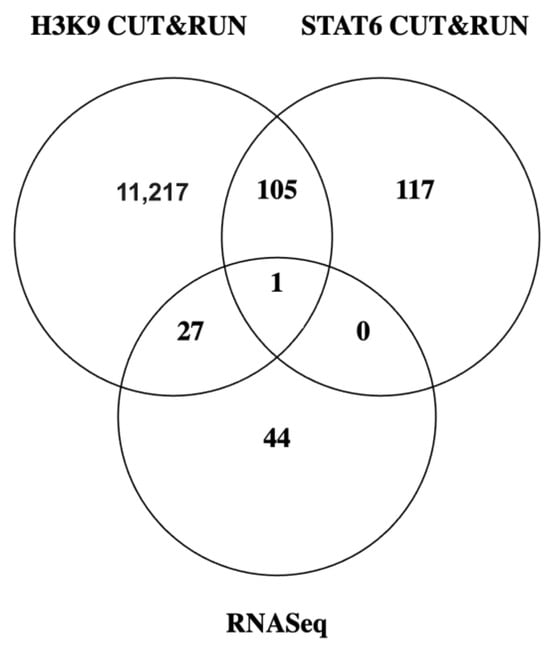 Overlap in genes identified by sequencing experiments. Gene lists from RNASeq experiments that showed increased expression, and H3K9ac and STAT6 target genes found using CUT&RUN were intersected in order to identify IL4-induced genes that are regulated by histone acetylation.