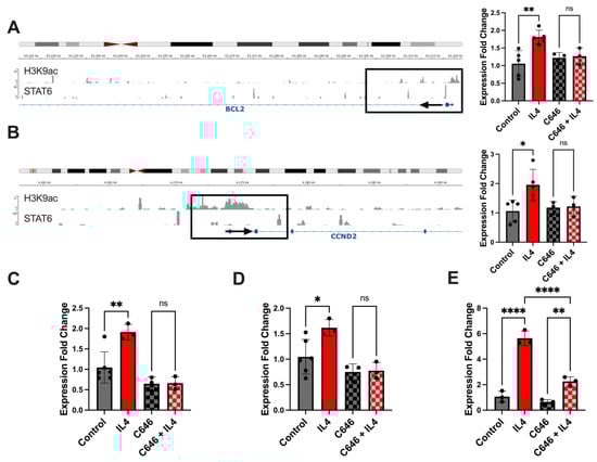 IL4 induces the expression of target genes in a histone acetyltransferase-dependent manner. (A,B) Integrative genome viewer views of signals from H3K9ac and STAT6 CUT&RUN experiments overlapping with BCL2 and CCND2 promoter regions (boxed). Black arrows indicate direction of gene from start site. Results of the quantitative RT-PCR analysis of the expression of the transcripts are shown to the right. (C–E) Quantitative RT-PCR for TNC, EP300, and ST8SIA1, respectively, in MDA-MB-231 cells. For all qRT-PCR experiments, cells were treated with 20 ng of recombinant IL4 with or without 20 μM C646 for 24 h before RNA collection. Results from three biological replicates are shown. * p < 0.05; ** p < 0.01; **** p < 0.0001; ns = non-significant.