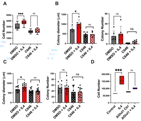 IL4-induced in vitro phenotypes are dependent on p300 activity and glucose uptake. (A) Cyquant proliferation assay showing increased numbers of BT549 cells treated with 10 ng of IL4 for 24 h. The inclusion of 10 μM C646 ablates the IL4-induced increase in cells. (B) The clonogenic assay of BT549 cells shows an increased colony size in cells treated with 10 ng of IL4, while the inclusion of 10 μM C646 ablates the effect of IL4 on the colony size. Cells were treated every 2 days for a total of 14 days in culture. (C) Murine mammary cancer 4T1 cells show an increased colony size after treatment with 10 ng of IL4, which is prevented by the inclusion of 10 μM C646. The colony number was unaffected by IL4. Cells were treated every 2 days for a total of 6 days in culture. (D) The Cyquant assay of MDA-MB-231 parental and Glut1 knockout cell lines shows that IL4-mediated proliferation is also dependent on glucose uptake. * p < 0.05; *** p < 0.001; ns = non-significant.