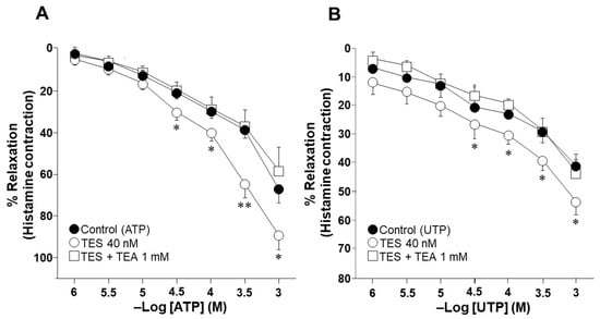 Effect of testosterone (TES) and tetraethylammonium (TEA) on ATP- and UTP-induced relaxation of guinea pig tracheal rings. (A) The guinea pig airway smooth muscle (ASM), previously constricted with histamine (His, 10 µM), was relaxed after the cumulative addition of ATP (1, 3.2, 10, 32, 100, 320, and 1000 µM). The concentration–response curve shifted to the left, indicating that a 48 h incubation with TES (40 nM) improved the relaxation response to ATP. Compared to the control group, tissues exposed to TES showed enhanced ASM relaxation at ATP 32, 100, 320, and 1000 µM. The effect of TES was abolished by the addition of TEA (1 mM), a nonspecific K+ channel blocker, suggesting that these channels are involved in the potentiation of smooth muscle relaxation. Symbols represent the mean values ± the standard error of the mean (S.E.M). ** p < 0.01, * p < 0.05. A one-way analysis of variance followed by a Dunnett’s test was performed (n = 9). (B) In a concentration-dependent manner, stimulation with cumulative concentrations of UTP (1, 3.2, 10, 32, 100, 320, and 1000 µM) relaxed tracheal tissues that had been pre-contracted with His (10 µM). Incubation with 40 nM TES for 48 h shifted the UTP relaxation curve to the left. TEA (1 mM) inhibited the increase in UTP-induced ASM relaxation, indicating the involvement of K+ channels in the effect of TES. * p < 0.05. A one-way analysis of variance was performed followed by a Dunnett’s test (n = 7).