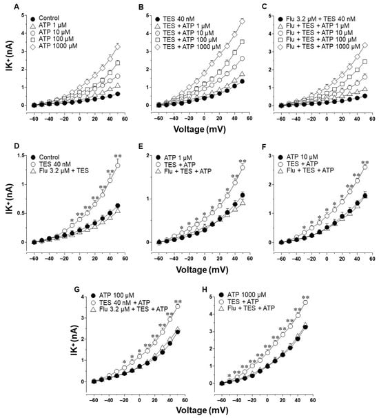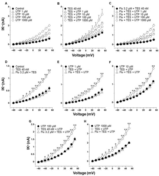 Since K+ channels are implicated in the ATP and UTP relaxation responses [], we conducted patch-clamp experiments to investigate whether TES could modify the K+ currents induced by these nucleotides. In these experiments, single myocytes were subjected to a depolarizing-pulse protocol from −60 to +50 mV. This protocol generated outward K+ currents that, under control conditions, peaked at ~0.6 nanoamperes (nA) at the maximum voltage tested (Figure 2A and Figure 3A, closed circle). The addition of increasing concentrations of ATP or UTP (1, 10, 100, and 1000 µM) over the depolarization step protocol augmented the K+ currents in a concentration-dependent manner (Figure 2A and Figure 3A). The highest ATP concentration tested produced a K+ current of approximately 3.3 nA (Figure 2A,H), while UTP 1000 µM reached a peak of ~2 nA (Figure 3A,H). Exposure of tracheal myocytes to TES 40 nM markedly increased the K+ currents generated by perfusion of ATP or UTP (Figure 2B and Figure 3B). The androgen receptor antagonist flutamide (Flu) reversed the enhancement of ATP- and UTP-induced K+ currents (Figure 2C and Figure 3C). To analyze the effects of TES and Flu appropriately, the increase in the K+ currents was compared concerning the tested concentration of ATP or UTP. Figure 2D and Figure 3D illustrate that TES markedly augmented the K+ currents induced by the protocol of depolarizing pulses alone from −10 mV and −30 mV ahead, respectively, and flutamide annulled this effect. These findings indicate a direct regulation of the androgen over K+ channels. Adding ATP or UTP at several concentrations (1, 10, 100, and 1000 µM) increased the K+ currents over the depolarizing steps protocol (Figure 2E–H and Figure 3E–H). Moreover, TES significantly improved the ATP- and UTP-induced K+ currents from −50 mV (Figure 2H), −40 mV (Figure 3E,G), −30 mV (Figure 2E,F and Figure 3H), or −20 mV ahead (Figure 2G and Figure 3F). Flutamide reversed this effect. Overall, these results confirm the genomic nature of the influence of TES on ATP- and UTP-induced K+ currents and the importance of P2Y receptors for generating K+ currents.