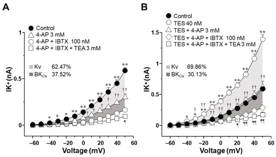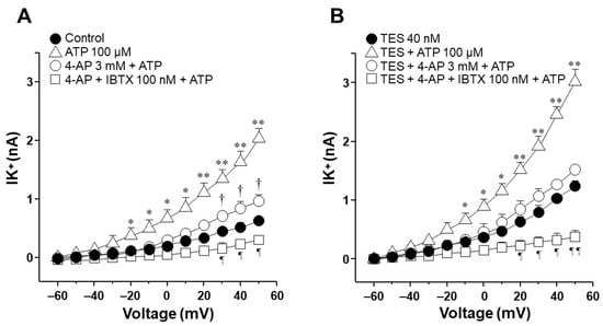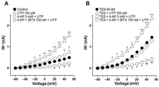 To find out which type of K+ channel is involved in the TES effect, we used blockers of the KV and the BKCa channels on the ATP- and UTP-induced K+ currents. In control tracheal smooth muscle cells, ATP and depolarizing pulses increased the K+ currents, which peaked at approximately 2.1 nA (Figure 4A, open triangle). The perfusion of 4-aminopyridine (4-AP, 3 mM, a blocker of KV channels) partially decreased the ATP 100 µM-induced K+ currents from −20 mV ahead (open circle), but it did not reach the values of the control K+ currents caused by depolarizing pulses (closed circle). The summative addition of iberiotoxin (IBTX, 100 nM, the selective blocker of BKCa channels) decreased the remaining ATP-induced K+ currents from 30 mV forward (Figure 4A) below the control trace. These results confirm that the K+ current generated by ATP (along with the depolarizing pulses) is due to the opening of KV and BKCa channels, as we previously demonstrated []. Moreover, as shown in Figure 2, TES 40 nM (for 48 h) significantly improved the ATP-induced K+ currents. 4-AP almost entirely suppressed the resulting K+ currents from −10 mV onwards, and IBTX blocked the remaining K+ currents (Figure 4B). The results were similar when the K+ currents were induced by UTP. Under control conditions, UTP 100 µM generated a K+ current that peaked at approximately 1.6 nA, and 4-AP partially reduced this K+ current from −20 mV ahead. At the same time, the consecutive addition of IBTX abolished the K+ currents elicited by UTP (Figure 5A). As shown in Figure 3, TES-treated myocytes showed a significantly augmented UTP-induced K+ current (Figure 5B), which was almost abolished by 4-AP from −30 mV forward. The consecutive addition of IBTX annulled the UTP-induced K+ currents. These results indicate that the effect of TES appears to be mediated mainly through the action of KV channels.