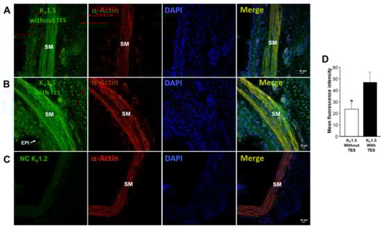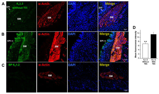 Previous immunofluorescence assays confirmed that the expression of two subtypes of KV, KV1.2 and KV1.5, in the ASM of guinea pigs increased when tracheal rings were exposed to 40 nM TES for 48 h (Figure 7 and Figure 8) []. These results were analyzed by measurements of mean fluorescence intensity illustrated in Figure 7D and Figure 8D. Negative controls, including incubation with the corresponding blocking peptide or no primary antibody incubation, confirmed antibodies’ specificity against KV1.2 and KV1.5 proteins. No fluorescence signal was detected in the negative controls. The colocalization of the two K+ channels in the ASM was confirmed by detecting smooth muscle α-actin in Figure 7A,B and Figure 8A,B.