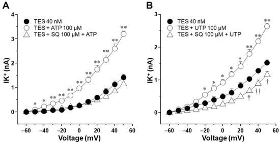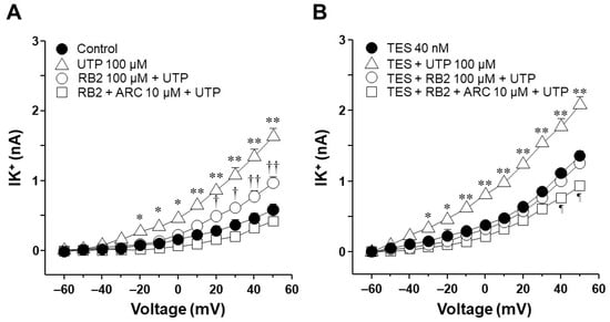 Role of P2Y4 receptors in the improvement of UTP-induced K+ currents caused by testosterone (TES). (A) Outward K+ currents (IK+) were elicited by depolarizing steps from −60 to +50 mV (control, closed circle). The IK+ increased in response to 100 µM UTP. This effect was partially attenuated by 100 µM RB2, which antagonizes the action of P2Y1,4,6,11,12,13 receptors except for P2Y2, and completely abolished by 10 µM AR-C118925XX, a specific P2Y2 receptor antagonist (n = 5). (B) In tracheal myocytes, UTP-induced IK+ increased significantly after 48 h of exposure to 40 nM TES (open triangle). These currents were blocked by 100 µM RB2, and the subsequent addition of 10 µM AR-C118925XX did not modify the IK+ (n = 5). These results suggest that the TES-mediated enhanced response to UTP involves P2Y4 receptors. Symbols represent mean values ± S.E.M. In figure (A), * p < 0.05, ** p < 0.01 comparing UTP vs. control, RB2 + UTP and RB2 + ARC + UTP groups; † p < 0.05, †† p < 0.01 comparing control vs. RB2 + UTP group. In figure (B), * p < 0.05, ** p < 0.01 comparing TES + UTP vs. TES, TES + RB2 + UTP and TES + RB2 + ARC + UTP groups; ¶ p < 0.05 comparing TES vs. TES + RB2 + ARC + UTP group. A one-way analysis of variance was performed, followed by a Student–Newman–Keuls test.