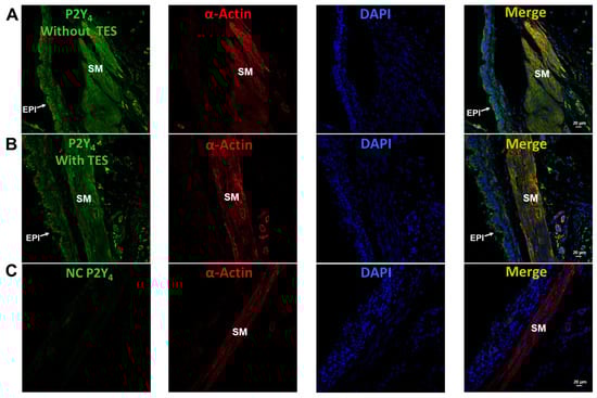 Testosterone (TES) does not modify the expression of P2Y4 receptors in airway smooth muscle. The first column shows preparations from guinea pig trachea, in which immunofluorescence for P2Y4 receptors in airway muscle is shown in green without (A) and with 40 nM TES incubated for 48 h (B). (C) The P2Y4 receptors did not fluoresce when no antibody was used (NC = negative control). The second column shows the α-actin of the smooth muscle (red), while the third column shows the cell nuclei (blue). Merged images from the first three panels are shown in the fourth column indicating the colocalization of P2Y4 receptors in the smooth muscle. SM = smooth muscle, EPI = epithelium.