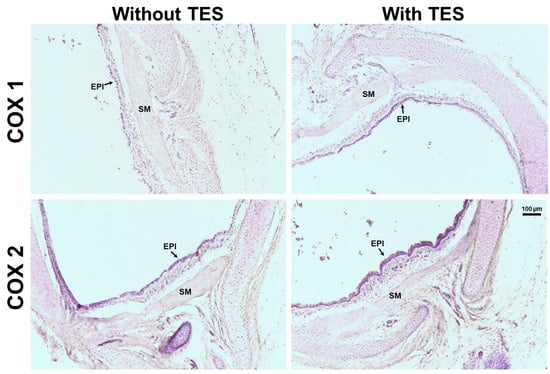 Tracheas from guinea pigs were obtained as described above and then incubated with and without TES 40 nM for 48 h at 9 °C. Then, tracheal tissue was fixed in 4% paraformaldehyde for 4 h and placed in 30% ethanol until their inclusion in paraplast plus (Sigma Aldrich Co., St. Louis, MO, USA). Once paraffinized, tissue blocks were cut into thin slices (5 μm) and placed over gelatinized slides. Paraffin was removed by incubation at 60 °C and placed in xylol, followed by graded alcohols, and then slices were washed with Tris-buffered saline (TBS). Slices were transferred into a Sequenza slide rack, washed with TBS, and permeabilized with 0.5% Triton/TBS. To block nonspecific binding to proteins, 10% horse serum was applied to the slices for 2 h at 32 °C. The sections were incubated with Bloxall blocking solution (Vector Laboratories, Burlingame, CA, USA) for 20 min at room temperature. The slides were incubated overnight at 4 °C with the rabbit polyclonal antibody to COX-1 (sc-7950, Santa Cruz Biotechnology, CA, USA) or COX-2 (sc-7951,) both diluted 1:25. For negative control, the primary antibody was omitted. After washing with TBS, the sections were incubated with donkey anti-rabbit IgG HRP (Thermo Fisher Scientific, Rockford, IL, USA) for 20 min and washed with TBS. Finally, the Betazoid DAB Chromogen Kit (Biocare Medical Pike Lane, CA, USA) was added to each section for 4 min. All slices were counterstained with hematoxylin (Biocare Medical Pike Lane, CA, USA) and maintained with a Sub-X mounting medium (Electron Microscopy Sciences, Hatfield, PA, USA). Images were collected and processed with a Nikon eclipse Ni microscope (Tokyo, Japan). For display purposes, images in which COX-1 or COX-2 is brown and nuclei are blue were merged.