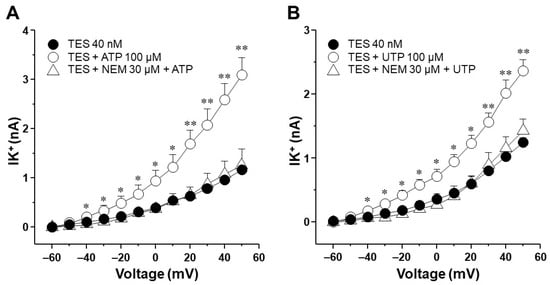 Importance of the activation of G proteins in the effect of testosterone (TES) on ATP- and UTP-induced K+ currents. Tracheal myocytes were subjected to step depolarizing pulses ranging from −60 to +50 mV in 10 mV increments. (A) ATP (100 µM) caused a significant increase in the outward K+ currents (IK+) in airway smooth muscle cells pre-treated with TES (40 nM). The addition of N-ethylmaleimide (NEM; 30 µM), which uncouples several receptors from G proteins, nullified this effect (n = 4). (B) Similarly, the myocytes pre-treated with TES showed an increase in the IK+ upon exposure to UTP (100 µM), which was also abolished by the addition of 30 µM NEM (n = 4). Symbols represent mean values ± S.E.M. In panel (A), * p < 0.05, ** p < 0.01 comparing TES vs. TES + ATP group. In panel (B), * p < 0.05, ** p < 0.01 when comparing TES vs. TES + UTP group. Repeated measure analyses of variance were performed, followed by Dunnett’s multiple comparison tests.
