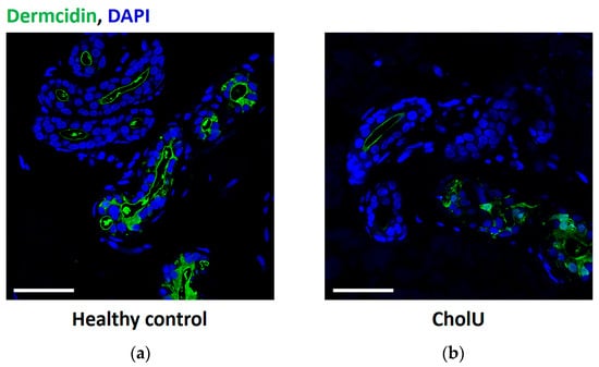 Dermcidin staining (green) in sweat glands from (a) healthy controls and (b) CholU patients shows clear signals within the sweat glands but not in the surrounding tissue. Images are representatives from n = 7 (CholU) and 5 healthy controls (HC). Scale bars: 50 µm.