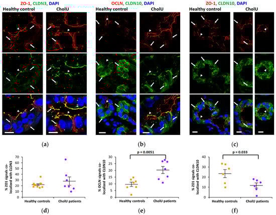 Images were analyzed using the co-localization tool of the Zeiss ZEN 3.0 SR (black) software (version 16.0.1.306) and results are shown in Figure 2d–f. ZO-1 signals were used as TJ markers and the percentage of ZO-1 colocalized with CLDN3 or CLDN10 was evaluated. Whereas the percentage of CLDN3-positive TJs was not affected in CholU patients (Figure 2d), the percentage of CLDN10-positive TJs decreased, indicating a general loss of CLDN10 in CholU patient sweat glands (Figure 2f). In contrast, the percentage of OCLN-positive signals co-localizing with CLDN10 was increased in CholU patient sweat glands, indicating that the redistribution of OCLN towards the canaliculi and of CLDN10 from the canaliculi towards the central duct results in a stronger overlap of the two proteins (Figure 2b,e).