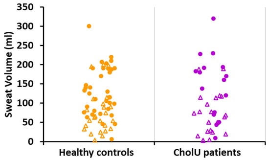 Sweat volume differed between male and female participants within both groups (Figure 3); however, there was no significant difference in total sweat volume between CholU patients and healthy controls, neither in the combined data, nor when comparing only males or females.