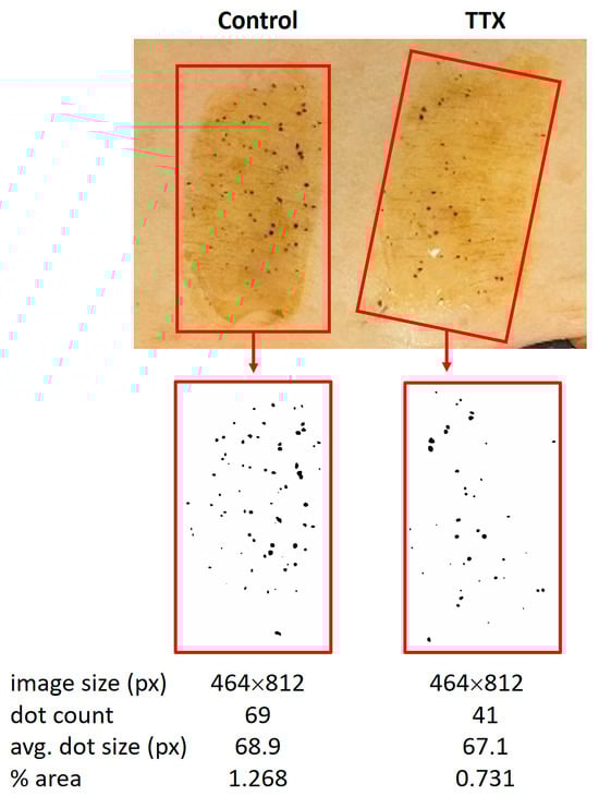 Quantification procedure of sweat production in isolated skin. In this example, control and TTX-injected skin areas were evaluated for sweat secretion. Sweat secretion was visualized by an iodine/starch reaction under oil in isolated skin. Secreted sweat could be identified as black dots that were photographed every 5 to 10 min. ImageJ (Version 2.9.0) was employed to convert the photographs into black and white images to evaluate the number and average (avg.) area of these dots (unit: number of pixels, px). The % area covered by sweat was calculated within each given experimental area (red rectangle). A summary of the quantifications is shown in Figure 6.