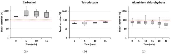 Time course of sweat secretion in isolated skin samples on the day of surgery. Quantification was carried out as exemplified in Figure 5. (a) Carbachol-stimulated sweat secretion (% of baseline secretion, n = 4 to 11 from 4 different patients for individual time points); (b) Inhibitory effect of TTX on sweat secretion (% of baseline secretion; n = 3 to 8 from 3 different patients for individual time points); (c) Inhibitory effect of local deodorant application (active component: aluminum chlorohydrate) on carbachol-induced sweat secretion (% of carbachol-induced sweat secretion in the absence of deodorant; n = 7 to 18 from 15 different patients for individual time points). Box plots depict the median, 1st and 3rd quartiles; whiskers indicate maximum and minimum values for each time point.