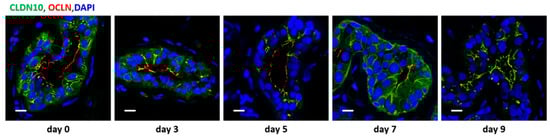 Immunofluorescence staining of the tight junction proteins CLDN10 (green) and OCLN (red) in sweat glands from healthy cultivated skin samples. From day 0 to day 5 of tissue culture, CLDN10 is localized in the canaliculi, OCLN in the central duct. On day 7 of tissue culture, the first signs of CLDN10 and OCLN signal overlap (yellow signal) become visible. On day 9 of tissue culture, signals of CLDN10 and OCLN are clearly overlapping. Scale bars, 10 µm. Representatives of 3 to 8 images per time point from 4 different patients.
