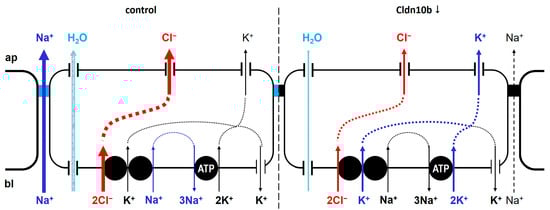 (i) It will render the paracellular pathway of the canaliculi less permeable to monovalent cations, especially to Na+. As depicted in Figure 8, the paracellular Na+ permeability is essential for sweat formation. Sweat formation is driven by active, transcellular Cl− secretion. Due to the basolateral localization of the Na+/K+ ATPase, Na+ cannot be secreted along the transcellular route. CLDN10b provides the basis for paracellular Na+ secretion, driven by the lumen-negative potential. Together, Na+ and Cl− increase the osmolarity of the primary sweat, so that water can follow through Aqp5 water channels (for review, see e.g., [28]). The loss of the paracellular Na+ transport pathways due to CLDN10b downregulation/redistribution may be compensated by transcellular K+ secretion through apical K+ channels [28] due to an increased lumen-negative potential (Figure 8). This should cause an increase in the K+ content of the sweat, similar to the increased K+ content in the saliva observed in a HELIX syndrome patient [20].