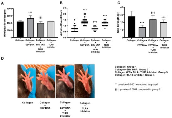 2.1. Toll-like Receptor 9 (TLR9) Inhibition Attenuates the Phenotypic Manifestations of Arthritis in an Epstein-Barr Virus (EBV) DNA-Exacerbated RA Mouse Model