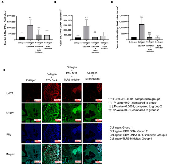 2.4. TLR9 Inhibition Decreases the Numbers of Double-Positive IL-17A+/IFN-γ+, Double-Positive IL-17A+/FOXP3+, and Triple-Positive IL-17A+/IFN-γ+/FOXP3+ Foci in an EBV DNA-Exacerbated RA Mouse Model