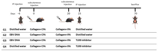 - Fadlallah, S.; Hussein, H.; Jallad, M.A.; Shehab, M.; Jurjus, A.R.; Matar, G.M.; Rahal, E.A. Effect of Epstein-Barr Virus DNA on the Incidence and Severity of Arthritis in a Rheumatoid Arthritis Mouse Model. Front. Immunol. 2021, 12, 672752. [Google Scholar] [CrossRef] [PubMed]