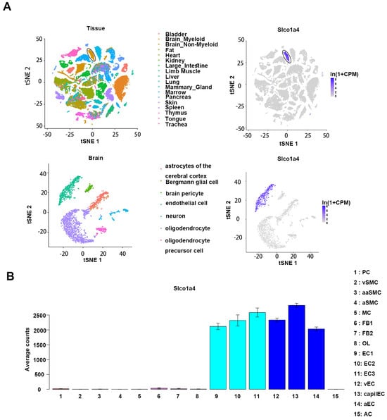 To identify novel markers of brain endothelial cells (ECs), we comprehensively screened publicly available scRNAseq databases. First, in the Tabula Muris dataset, which encompasses a single-cell atlas of 20 mouse organs representing 38 distinct cell types, Slco1a4 expression was only observed in the brain, but not in other organs [11] (Figure 1A). Further analysis revealed that, in the brain, Slco1a4 exhibited specific expression in ECs, but not other non-EC cell types, including pericytes (PC), smooth muscle cells (SMC), microglia (MG), fibroblast-like cells (FB), and oligodendrocytes (OL) [10] (Figure 1B). Then, the analysis of the endothelial cells scRNAseq atlas derived from the brain revealed that Slco1a4 was expressed in all brain EC subsets, including arterial, venous, and capillaries ECs [10]. Therefore, Slco1a4 is a potential marker for brain endothelial cells.