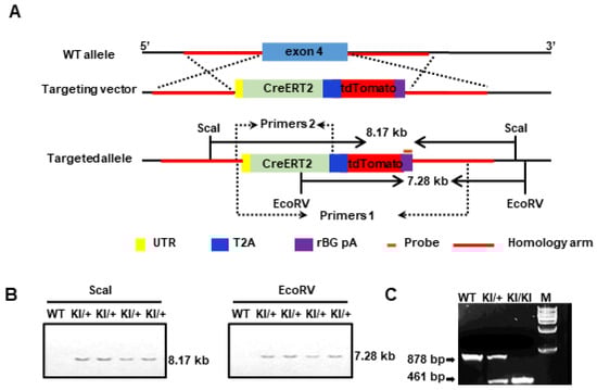 (A) Schematic models of the knock-in strategies for generating Slco1a4-CreERT2-tdTomato mouse lines via the CRISPR/Cas9 system; (B) Southern blot analysis of the Slco1a4-CreERT2-tdTomato knock-in allele. ScaI-digested genomic DNAs from wild-type (+/+) and heterozygous (KI/+) mice were hybridized with the probe, detecting an 8.17 kb band from the targeted allele. EcoRV-digested genomics DNAs hybridized the probe, detecting a 7.28 kb band from the targeted allele; (C) PCR genotyping of Slco1a4-CreERT2 wild-type (878 bp) and knock-in (461 bp) mice. Primer 1 was used to distinguish the wild-type allele and Primer 2 was used to distinguish the mutant allele. M is a 1 kb DNA Marker.