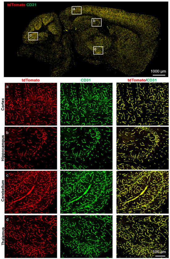 TdTomato was expressed in the cerebrovascular ECs of the Slco1a4-CreERT2 knock-in mouse line. Immunostaining of brain slices for tdTomato (red) and CD31 (green) in Slco1a4-CreERT2 knock-in mice at P56, confirming that tdTomato was detected in the endothelial cells of the cortex, hippocampus, cerebellum, and thalamus at P56. Scale bar: 100 μm.