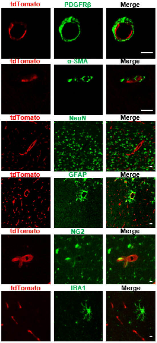 Tdtomato was not expressed in any other non-EC cell types in the brain. Immunofluorescence analysis showed that tdTomato was not expressed in the pericytes (PDGFRβ+), smooth muscle cells (α-SMA+), neuron (NeuN+), astrocytes (GFAP+), oligodendrocytes (NG2+), or microglial cells (IBA1+). Scale bar = 10 μm.