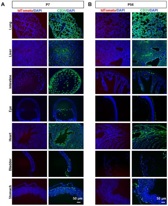 TdTomato was not expressed in the lung, liver, gut, eye, heart, bladder, or stomach. (A) TdTomato (red) and CD31 (green) immunostaining analysis in the lung, liver, gut, eye, heart, bladder, and stomach at P7. Scale bar = 50 μm. (B) TdTomato (red) and CD31 (green) immunostaining analysis in the lung, liver, gut, eye, heart, bladder, and stomach at P56. Scale bar = 50 μm.