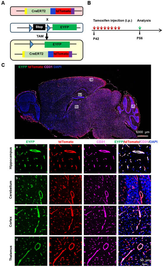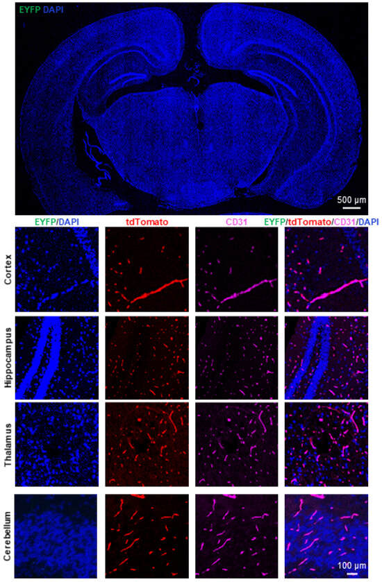 The blood–brain barrier (BBB) serves as a physical and metabolic interface, allowing for the passage of essential nutrients and preventing the entrance of potentially harmful substances [1,2]. The BBB consists mainly of endothelial cells (ECs) lining the blood vessels, pericytes, and astrocytes. Cerebrovascular ECs, compared to ECs in other tissues, are characterized by specialized tight junctions, low rates of transcytosis, and abundantly expressed specific transporters [3,4]. Subsequently, the unique functions of cerebrovascular ECs were verified by many gene manipulation mouse models based on the Cre-LoxP recombination system. Although several Cre mouse lines were generated to target ECs, such as Tie2-Cre and SP-A-Cre, only a few can specifically label cerebrovascular ECs [5,6,7]. For instance, we previously generated a transgenic mouse line in which Cre expression was driven by surfactant protein A (SP-A), a marker of alveolar type II cells of the lung. Unexpectedly, Cre activity was also observed in cerebrovascular ECs and gastric epithelium [8]. Furthermore, mice with SP-A-Cre mediated Smad4 deletion in cerebrovascular ECs caused perinatal intracranial hemorrhage (ICH) and death [9]. Therefore, there is a lack of inducible and more specific Cre mouse targeting in cerebrovascular ECs.