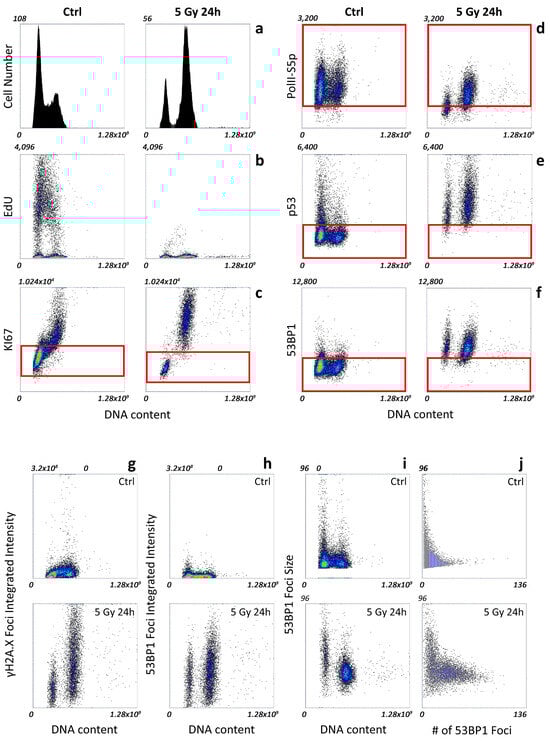 Image-cytometry analysis of a representative experiment of exponentially growing (n = 11399 cells) and X-ray irradiated (n = 6109) MCF10A cells showing the analysis of cell-cycle progression, proliferation state, transcriptional activity, p53 content measurement, and DDR response. (a) Histogram of DNA content distribution. (b) Dot plots of DNA content (X axis) versus EdU incorporation (Y axis) to mark active DNA replication. (c) Dot plots of DNA content (X axis) versus integrated intensity per cell nucleus of KI67 proliferation marker (Y axis). (d) Dot plots of DNA content (X axis) versus PolII-S5p mean intensity per pixel (Y axis). The red box was a guide drawn on the lower limit of the control-cell distribution approximated with Gaussian approximation. (e) Dot plots of DNA content (X axis) versus p53 mean intensity per pixel (Y axis). The red box was a guide drawn on the upper limit of the control-cell distribution approximated as a Gaussian approximation. (f) Dot plots of DNA content (X axis) versus nucleoplasm 53BP1 mean intensity per pixel (Y axis) calculated after subtraction of the mask corresponding to the identified DDR foci. The red box was a guide drawn on the upper limit of the control-cell distribution approximated as a Gaussian approximation. (g) Dot plots of DNA content (X axis) versus integrated intensity of the segmented γH2A.X foci per nucleus (Y axis). (h) Dot plots of DNA content (X axis) versus integrated intensity of the segmented γH2A.X foci per nucleus (Y axis). (i) Dot plots of DNA content (X axis) versus the average size (pixels) of the 53BP1 foci per nucleus (Y axis). (j) Dot plots of the number of 53BP1 foci (X axis) versus the average size (pixels) of the 53BP1 foci per nucleus (Y axis). Colors are representative of the density of the events.