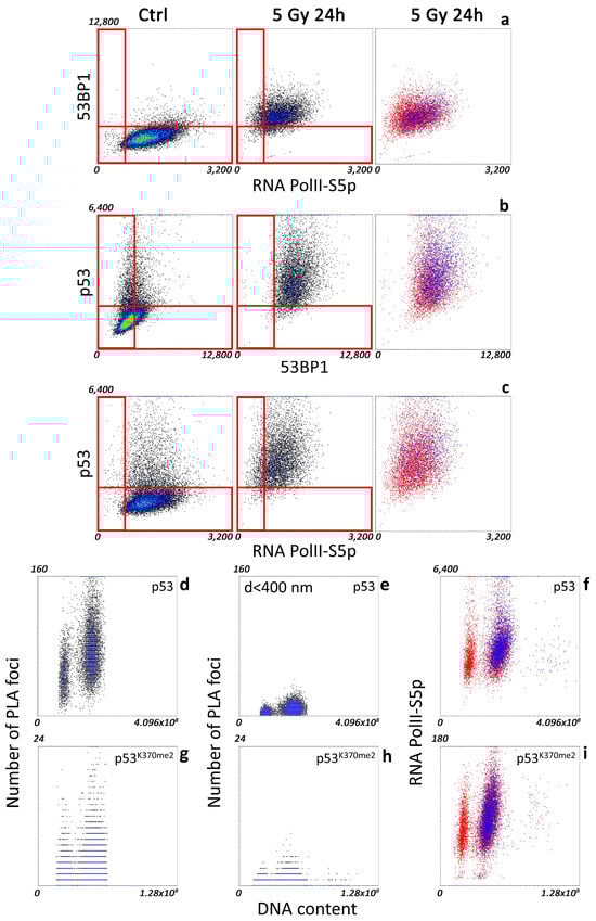Image-cytometry analysis of a representative experiment of exponentially growing and X-ray-irradiated MCF10A cells. (a) RNAPolII-S5p versus 53BP1, (b) 53BP1 versus p53, and (c) RNAPolII-S5p versus p53 mean intensity per nucleus (n = 7100). The red box was a guide drawn on the lower (PolII-S5p) or upper (p53, 53BP1) limit of the control-cell distribution approximated with a Gaussian approximation. The third column shows the distribution of cells with the highest expression of p53 (a), PolII-S5p (b), and 53BP1 (c) (blue dots) over the entire population (red dots). (d) Dot plots of DNA content (X axis) versus the number of segmented p53-53BP1 PLA spots per nucleus (Y axis) 24 h after irradiation. (e) Dot plots of DNA content (X axis) versus the number of the segmented p53-53BP1 PLA spots per nucleus (Y axis) having at least one γH2A.X focus within 400 nm at 24 h after irradiation. (f) Dot plots of DNA content (X axis) versus PolII-S5p mean intensity per pixel (Y axis) showing the distribution of cells with the highest number of PLA spots per nucleus (blue dots) over the entire population (red dots). (g–i) Dot plots reporting the same info shown in (d–f) referred to a PLA analysis of p53 di-methylated on lysine 370 and 53BP1 (n = 10,228). Colors, except for the last column of Dot Plots, are representative of the density of the events.