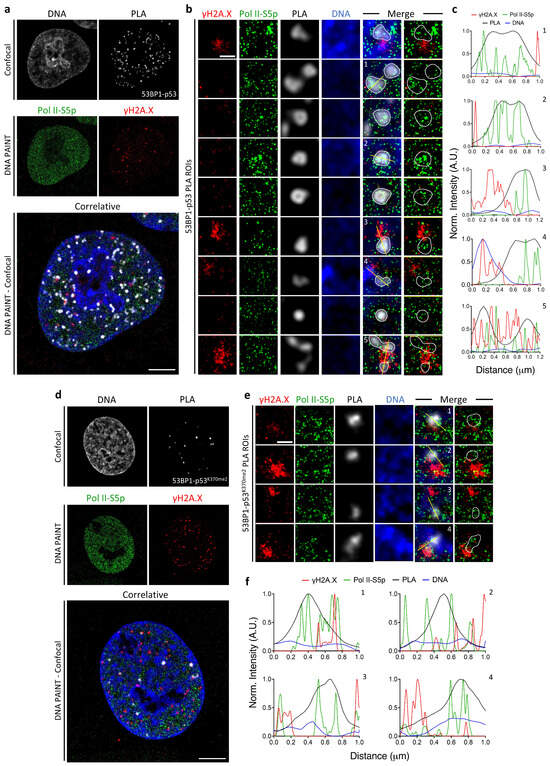 We thus decided to couple the PLA assay to SMLM by a correlative microscopy pipeline previously developed in our laboratory []. DNA PAINT microscopy was employed for a two-channel analysis of RNA Pol II-S5p and γH2A.X to monitor, at high resolution, the transcriptional and DDR processes. Confocal microscopy was simultaneously used to detect PLA foci and the spatial condensation of chromatin. The number of molecular events inside and in proximity to the p53-53BP1 interaction sites was thus calculated. At the same time, the ultrastructure of damaged DNA regions was revealed and their relative position to the transcriptional events measured.