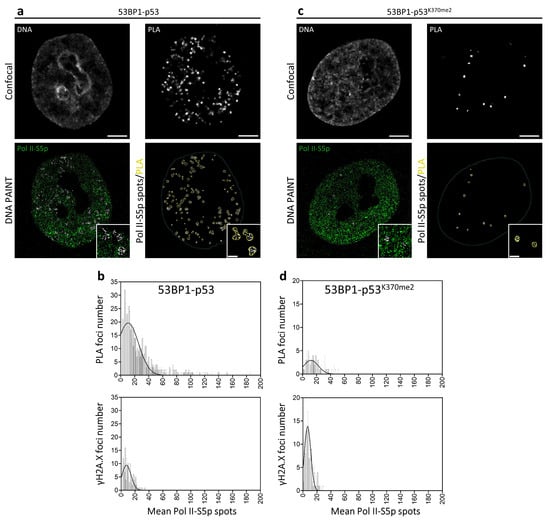 As previously performed for the image-cytometry diffraction-limited analysis, we repeated the PLA assay by looking at the di-methylated p53 on Lysine 370. The obtained results (Figure 3d–f and Figure 4c,d) confirmed the localization of the putative p53K370me2-53BP1 complex in decondensed chromatin regions and its association with the general transcriptional machinery.