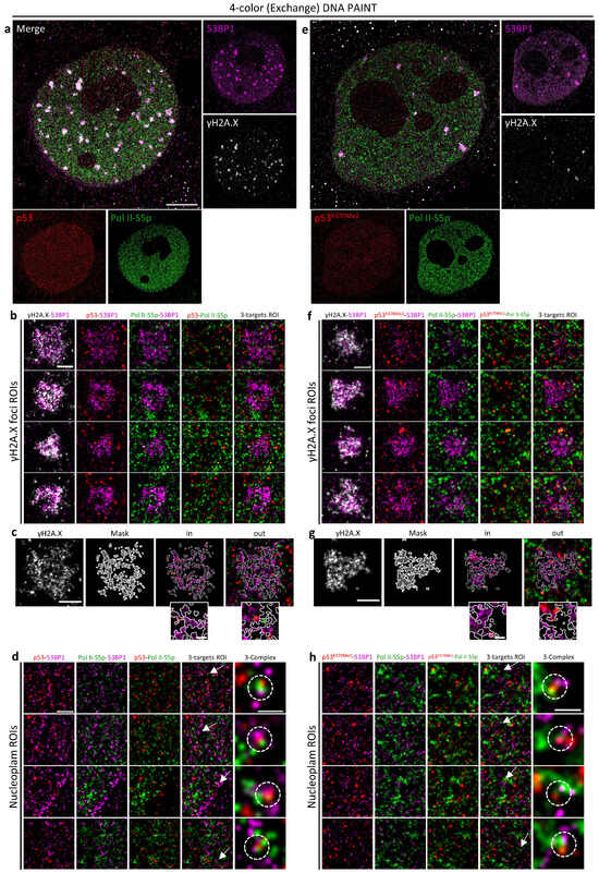 Analysis of p53, p53K370Me2, 53BP1, Pol II-S5p, and γH2A.X interaction at molecular level by 4-color Exchange PAINT of X-ray-irradiated MCF10A nuclei. (a,e) Shown is the single-molecule acquisition of 53BP1 (magenta), p53 (a) and p53K370Me2 (e) (red), Pol ll-S5p (green), and γH2A.X (white) of a representative cell. Target proteins were sequentially acquired using Cy3b and ATT0655 imagers. Imaging parameters: 20,000 frames/ch, 90 ms exposure, 1 nM total imager concentration. Scale bar: 5 μm. (b,f) Representative ROIs showed the molecular distribution of 53BP1 (magenta), p53 (b) and p53K370Me2 (f) (red), and Pol ll-S5p (green) in IR-induced DNA damage foci detected by γH2A.X (white) (IR; 5 Gy). The segmentation analysis of a representative γH2A.X focus (c,g) showed relevant colocalization with 53BP1 signal (in); nevertheless, 53BP1 and γH2A.X foci evinced different spatial distributions (b,f). p53, p53K370Me2, and Pol ll-S5p did not show a significative overlap (out), in agreement with the downregulation of the transcriptional program during the DNA damage and repair processes. Scale bar: 500 nm, 100 nm. (d,h) Representative ROIs showed the molecular distribution of 53BP1, p53, p53K370Me2, and Pol ll-S5p in nucleoplasm. In both the p53 and p53K370Me2 samples, multi-color DNA PAINT revealed a proximity between protein targets (white arrows), suggesting a putative three-complex between Pol ll-S5p, 53BP1 and two p53 isoforms (white dot circles). Scale bar: 500 nm, 100 nm.