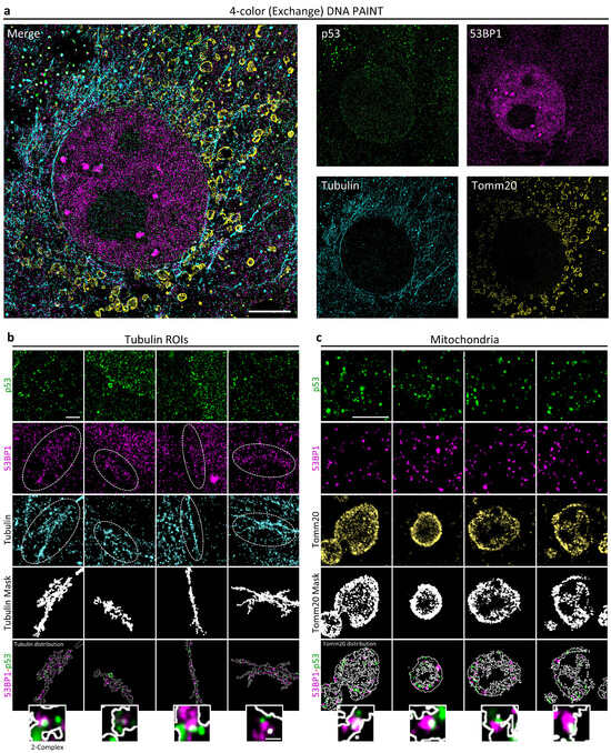 Analysis of molecular distribution of 53BP1 and p53 in cytoskeletal (β-Tubulin) and mitochondrial (Tomm20) compartments on X-ray-irradiated MCF10A cells. (a) Shown is the 4-color Exchange PAINT image of 53BP1 (magenta), p53 (green), Tomm20 (yellow), and β-Tubulin (cyan) of a representative cell. Scale bar: 5 μm. (b) Tubulin ROIs showed the molecular distribution of p53 (green) and 53BP1 (magenta) on β-Tubulin signal (cyan). Shown is a significant accumulation of 53BP1 signal on a β-Tubulin structure (white dot ellipses). The segmentation analysis of β-Tubulin filaments revealed a relevant colocalization with a 53BP1 signal. Interestingly, multi-color DNA PAINT detected 53BP1-p53 interaction alongside the β-Tubulin signal. (c) Mitochondria ROIs showed the molecular distribution of p53 (green) and 53BP1 (magenta) on the Tomm20 signal (yellow). As a cytoskeletal compartment, the segmentation analysis of the Tomm20 signal showed off a colocalization between 53BP1-p53 in mitochondria. Scale bar: 1 μm, 100 nm.