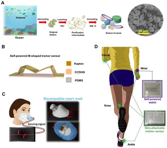 - Rajabi-Abhari, A.; Kim, J.-N.; Lee, J.; Tabassian, R.; Mahato, M.; Youn, H.J.; Lee, H.; Oh, I.-K. Diatom bio-silica and cellulose nanofibril for bio-triboelectric nanogenerators and self-powered breath monitoring masks. ACS Appl. Mater. Interfaces 2021, 13, 219–232. [Google Scholar] [CrossRef] [PubMed]