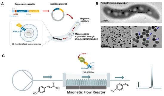 - Mittmann, E.; Mickoleit, F.; Maier, D.S.; Stäbler, S.Y.; Klein, M.A.; Niemeyer, C.M.; Rabe, K.S.; Schüler, D. A Magnetosome-based platform for flow biocatalysis. ACS Appl. Mater. Interfaces 2022, 14, 22138–22150. [Google Scholar] [CrossRef] [PubMed]