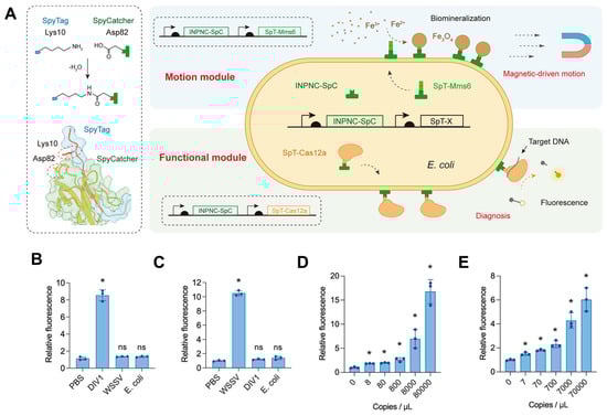 - Chen, H.; Zhou, T.; Li, S.; Feng, J.; Li, W.; Li, L.; Zhou, X.; Wang, M.; Li, F.; Zhao, X.; et al. Living magnetotactic microrobots based on bacteria with a surface-displayed CRISPR/Cas12a system for Penaeus viruses detection. ACS Appl. Mater. Interfaces 2023, 15, 47930–47938. [Google Scholar] [CrossRef] [PubMed]
