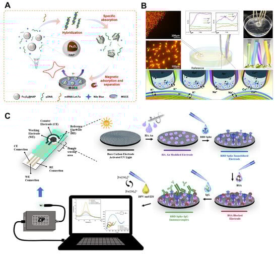 - Chen, Z.; Ai, Y.; Yang, W.; Niu, L.; Wang, Q.; Gao, F. Specific adsorption of magnetic Fe3O4@hydroxyapatite nanocomposites to a hybridized duplex for immobilization and label-free electrochemical biosensing of MicroRNA. ACS Appl. Nano Mater. 2023, 6, 8584–8592. [Google Scholar] [CrossRef]