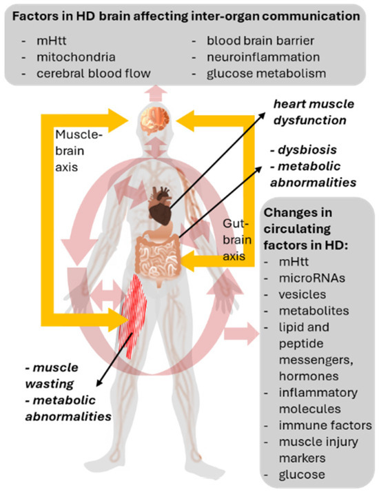 Different HD-related metabolic impairments in various organs likely inter-dependently influence disease progression. In combination with metabolic alterations and impaired inter-tissue crosstalk, structural deterioration in tissues such as skeletal muscle, heart, adipose tissue, and bone leads to cachexia and impaired gut/gut-microbiome structure and function may influence systemic metabolism, including of the brain [4].