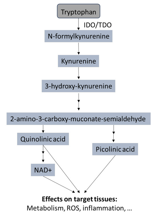 Accumulating evidence suggests that gut microbiota regulate KP metabolism and interference with the microbiome, thus, likely influencing the gut–brain axis [168]. TRP availability in KP metabolism can be modulated by changes in diet and lifestyle [169,170]. However, a diet rich in TRP is unlikely to be related to greater TRP availability to the brain as most individuals (even older individuals and patients) consume adequate amounts of this essential amino acid [171,172]. Moreover, TRP competes with other large neutral amino acids (LNAA) for transport across the blood–brain barrier, which limits TRP availability for the cerebral KP [173]. Therefore, the effect of diet on the TRP level in the brain depends on the TRP/LNAA ratio, which can be improved by a carbohydrate-rich diet by promoting insulin secretion and the absorption of LNAA by muscles. On the other hand, certain nutrients and bioactive compounds (such as antioxidants, omega-3 fatty acids, and probiotics) may suppress indoleamine-2,3-dioxygenase (IDO) activity, which degrades TRP into KYN, and slow down Th1-type immune activation cascades [174].