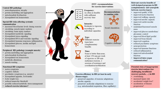 - Mueller, S.M.; Petersen, J.A.; Jung, H.H. Exercise in Huntington’s Disease: Current State and Clinical Significance. Tremor Other Hyperkinet Mov. 2019, 9, 601. [Google Scholar] [CrossRef]